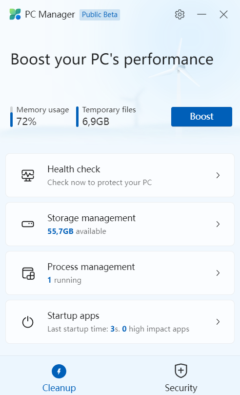 Tranquilo, no te voy a hacer un tutorial porque resulta que Microsoft ha decidido por fin juntar todo estas tareas en una app gratuita y hecha por ellos llamada «PC MANAGER» que es como el Carlos Alcaraz de apps para optimizar el rendimiento de tu ordenador.