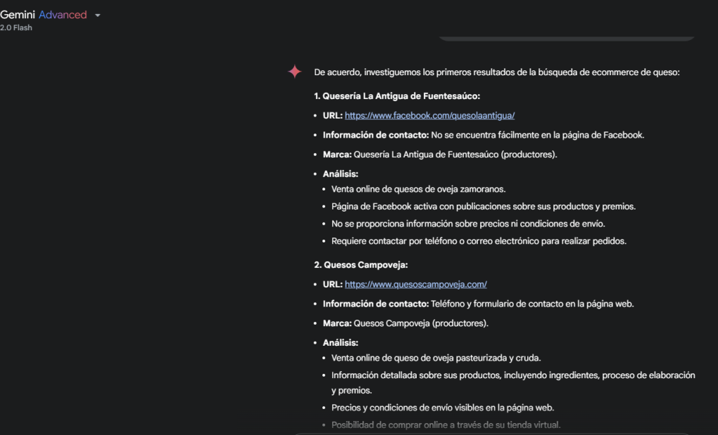- Búsqueda exhaustiva: Utilizaremos buscadores (Google, Bing, etc.) con palabras clave como «comprar queso online», «quesos online España», «tienda online de quesos», etc.