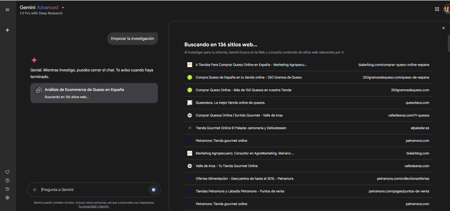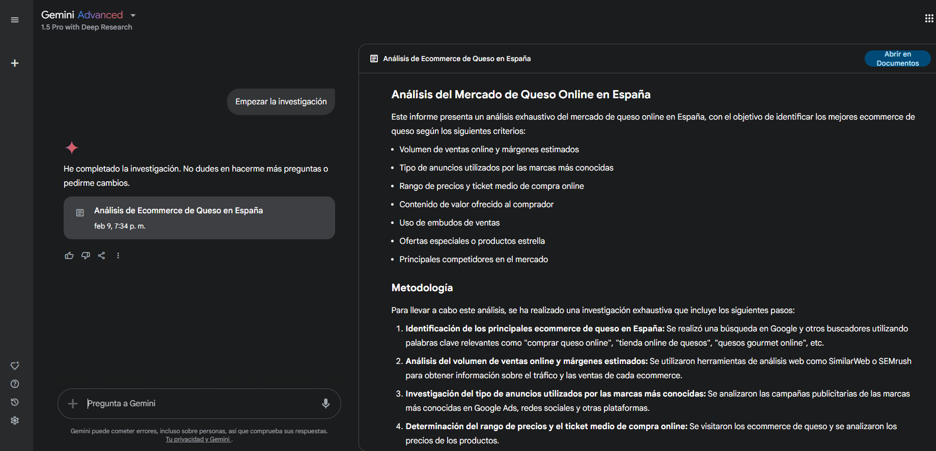 Se inicia un super, mega, alucinante viaje en forma de diálogo donde la IA va buscando detalles y te va pidiendo tu confirmación de que eso lo incluya o no en el informe final y te pide si tiene que profundizar en un aspecto o no.
